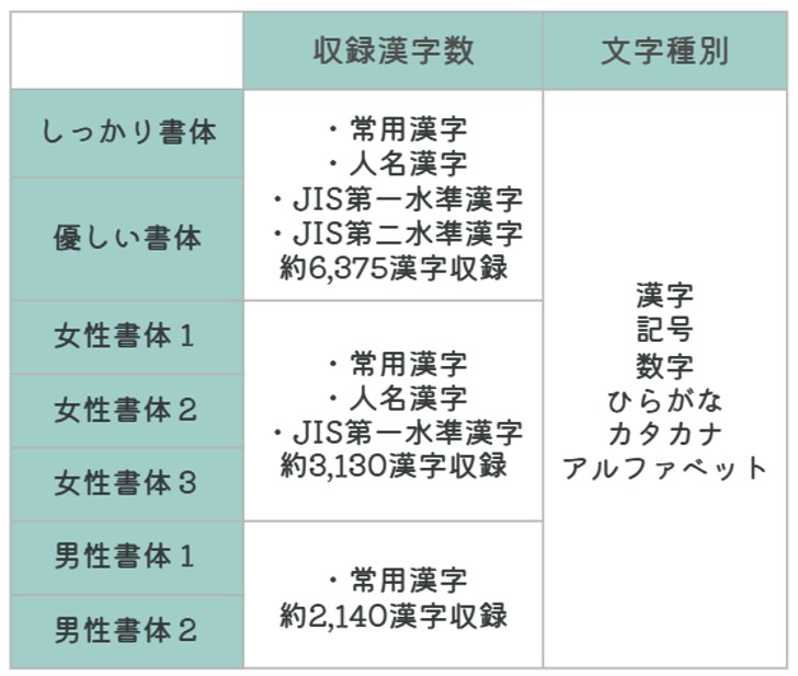 「しっかり書体」、「優しい書体」、「女性書体1」、「女性書体2」、「女性書体3」、「男性書体1」、「男性書体2」