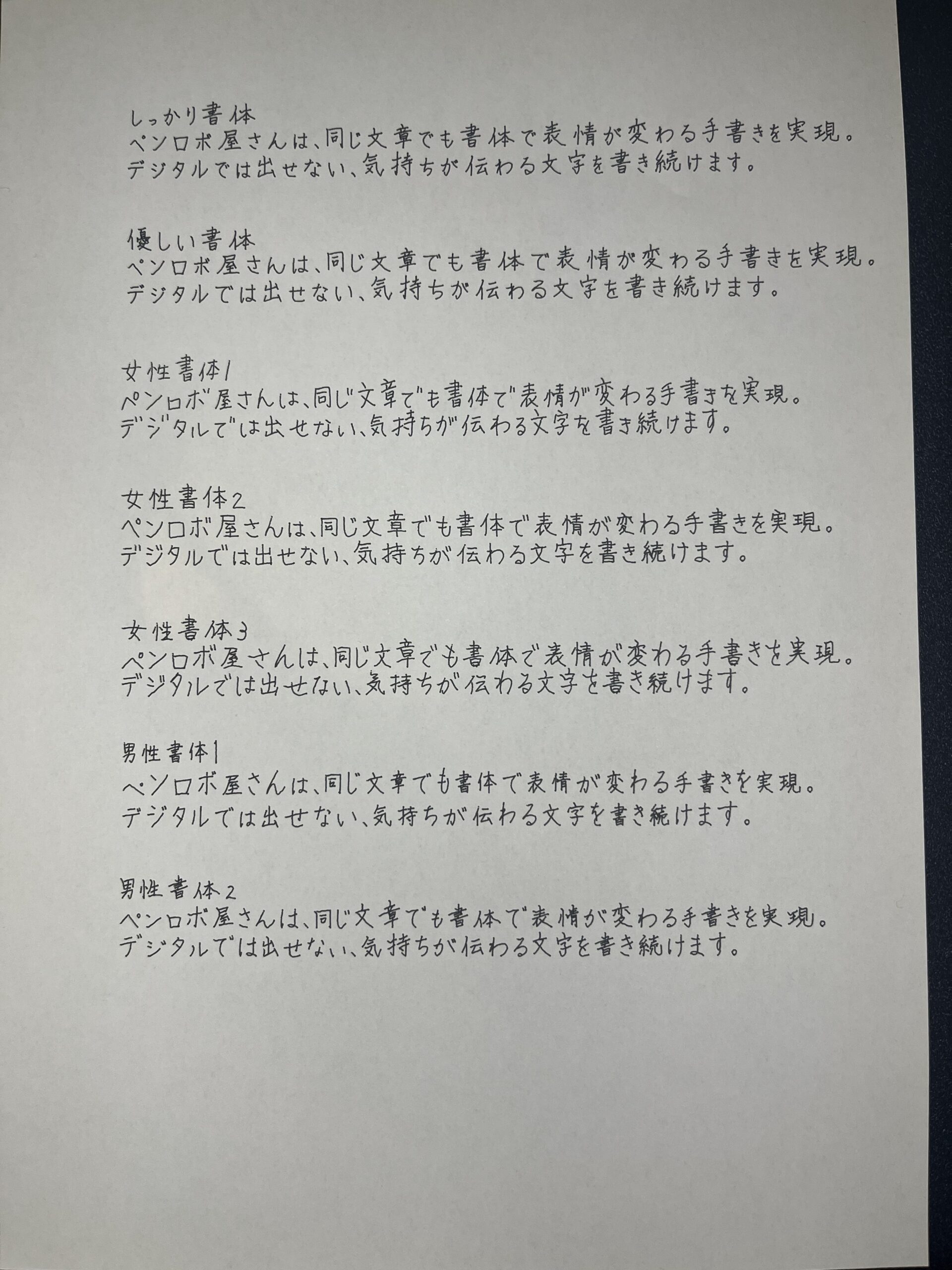 「しっかり書体」、「優しい書体」、「女性書体1」、「女性書体2」、「女性書体3」、「男性書体1」、「男性書体2」